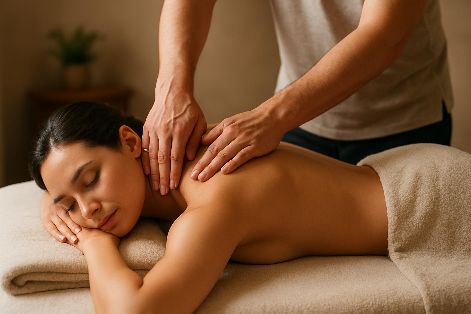 • Close-up of hands working on shoulders, focusing on technique (alt: “Hands applying deep tissue massage”).